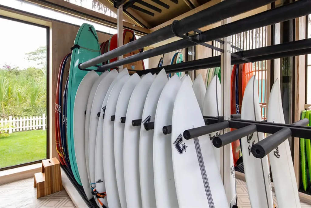 The Gilded Iguana's legendary Surf Club offers great surfing experience with access to over 150 premium surfboards including Channel Islands performance boards, longboards, beginner boards, SUPs, and boogie boards—all just steps from Playa Guiones' five-mile stretch of consistent waves. Professional ISA-certified surf instructors provide lessons for all ages and skill levels, while the club features air-conditioned board storage, changing facilities, juice bar, and personal board caddy service, creating a ski-resort atmosphere for surfing enthusiasts.